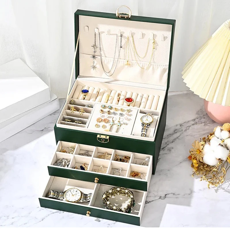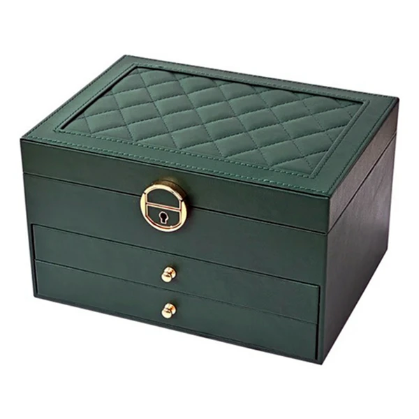 این جعبه ی نظم دهنده جواهرات و زیورآلات بسیار کاربردی و زیبا از جنس چرم PU با ساختاری مستحکم ، بادوام و دوختی ظریف است و دارای طرح برجسته روی کار ، گیره فلزی و قفل کلید دار میباشد . این جعبه دارای سه محفظه جهت نگهداری تمامی جواهرات و زیورآلات بانوان از قبیل گوشواره ، گردنبند ، دستبند ، انگشتر ، النگو ، ساعت مچی و... می باشد و همچنین میتوان از فضای اضافی برای نگهداری لوازم آرایشی بانوان را نیز استفاده کرد . طراحی زیبا و کیفیت بالا این جعبه جواهرات را به هدیه ای منحصر به فرد برای عزیزانتان تبدیل کرده است .