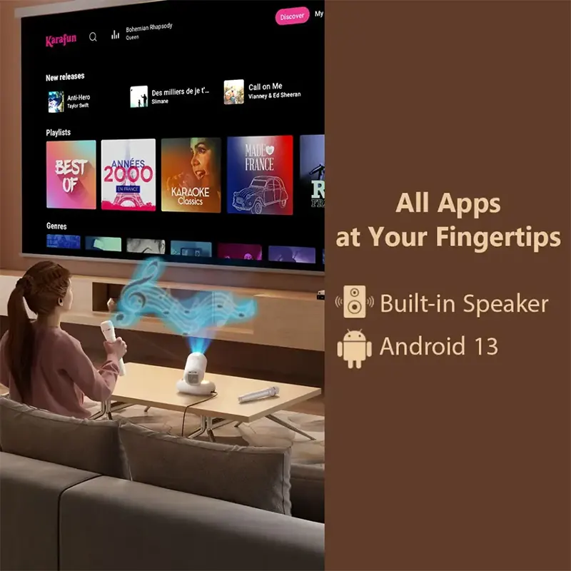 - سیستم عامل هوشمند اندروید 13: به دنیایی از سرگرمی دسترسی داشته باشید. مستقیماً از طریق پروژکتور به اپلیکیشنهای پخش آنلاین مانند یوتیوب و نتفلیکس متصل شوید و محتوای مورد علاقه خود را بدون نیاز به دستگاه جانبی پخش کنید.