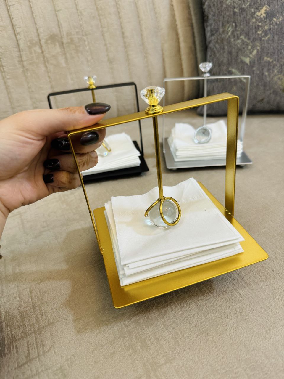 یه دکوری خوشگل و کاربردی برای میز پذیرایی 😍 استند جادستمال وارداتی، با طراحی خاص و شیک ✨ تو سه رنگ جذاب: مشکی، طلایی و سیلور 🖤💛🤍 کوچیکه اما حسابی میزت رو خاص میکنه 💫