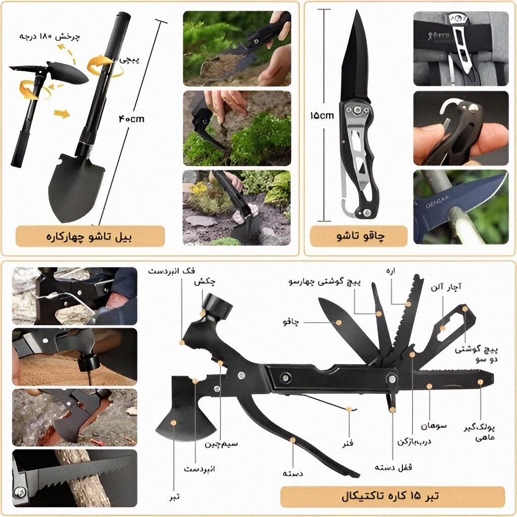 مجموعه ابزار ضروری بقا و نجات (چاقو، ابزار چندکاره، آتشزنه / اره / قطبنما و …) طراحی جمعوجور و قابل حمل برای سفر، کمپ، طبیعتگردی یا شرایط اضطراری کاربرد چندمنظوره: مناسب برای بقا، امداد، طبیعتگردی، سفر و شرایط غیرمنتظره